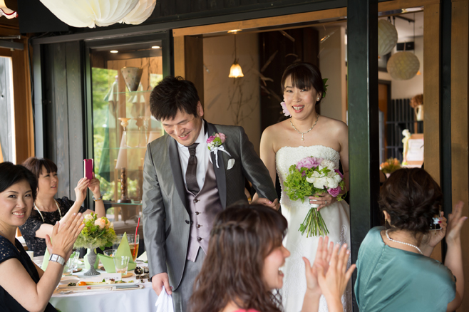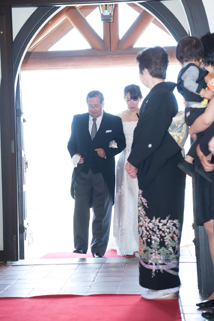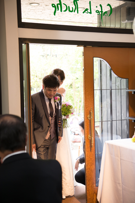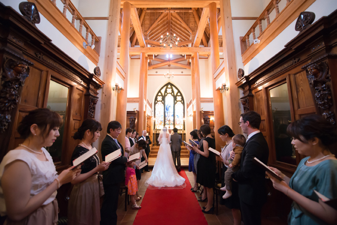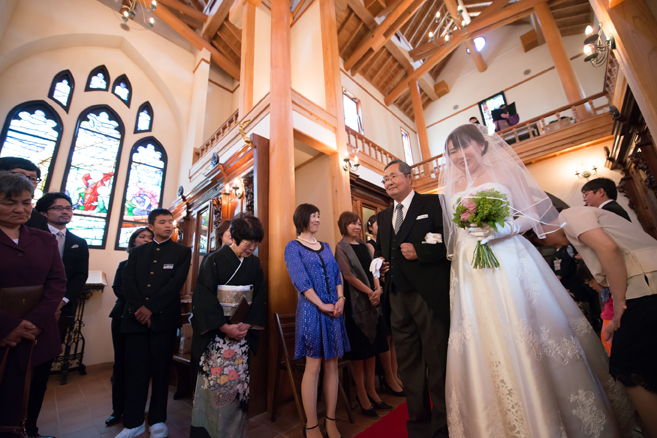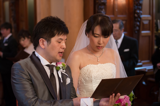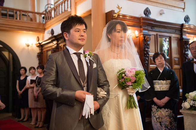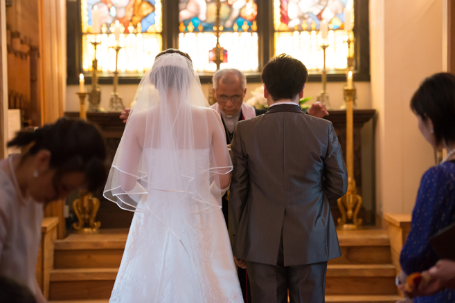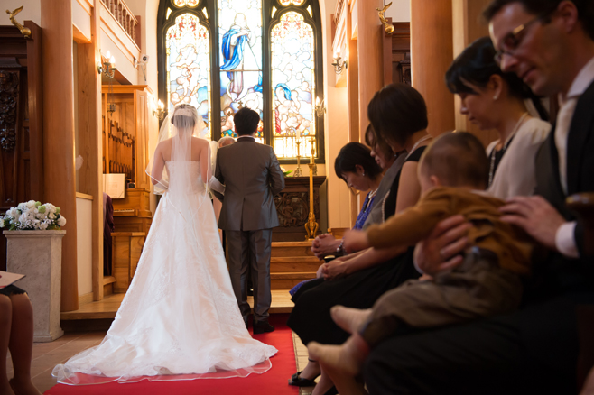 この日は花婿が先に入場、花嫁は後からお父様と入場されて、お母様からベールダウンをして頂き、バトンタッチ。キリスト教式でしたので、牧師の先生に来て頂き式を執り行いました。最後の撮り下ろしの写真は教会(ステンドグラス美術館)の中庭にて。それではパーティー会場へ移動しましょう。