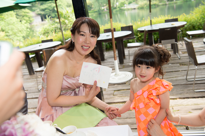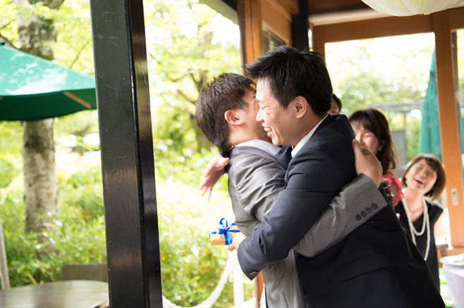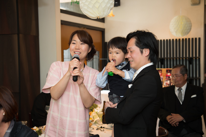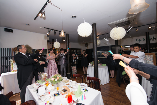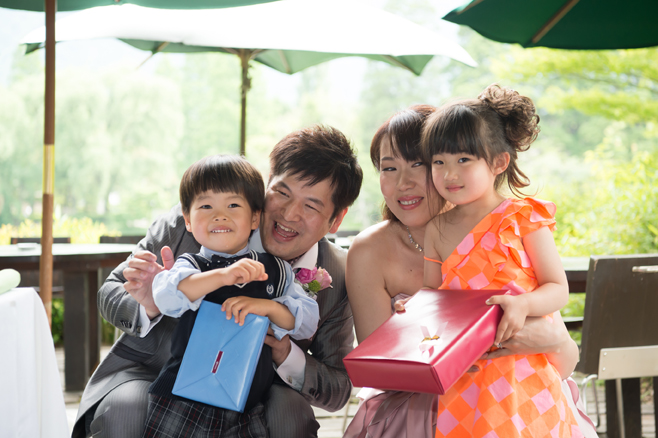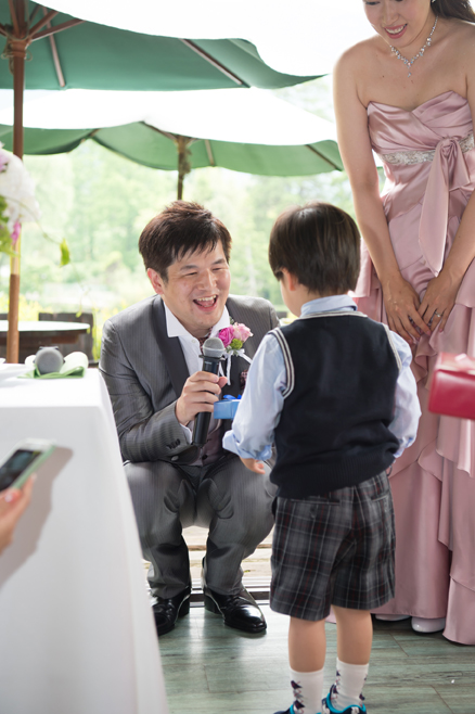 パーティー後半、お色直ししたおふたりは来てくれた子どもたちへプレゼントタイム。おふたが出会うきっかけをくれた大事なご友人にも感謝の気持ちをおくりました。そして白熱のテーブル対抗ゲーム後の、新郎様から新婦様へのサプライズプレゼント。プレゼントといっしょにお話された新郎様の言葉に、涙腺の緩むスタッフ続出でございました。