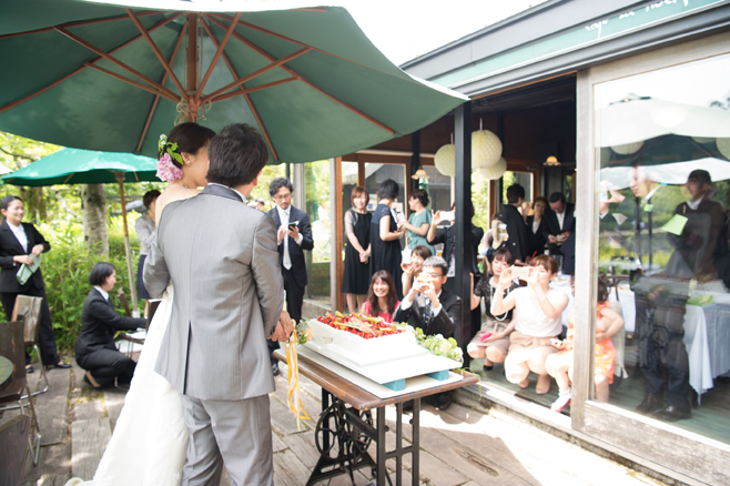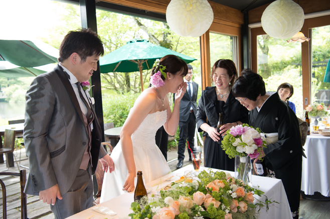 披露パーティーは新郎様のウエルカムスピーチから始まり、乾杯、プロフィール紹介(サラッと。ご本人希望)からスタート。ケーキ入刀の際はファーストバイトとサンキューバイト(ご両家お母様へケーキを食べさせあいっこします)も行いました。お母様はもちろん嬉しそうでしたよ。ちなみにケーキ入刀はしたいけどファーストバイト(サンキューバイトなど)はしたくない、そんなお客様も時にいらっしゃいますが、yufuin weddingではファーストバイトはオススメしております。ケーキ入刀でゲストの方が写真を撮り、席に戻られす際に「寂しい空気になりづらい」と考えております。コレ結構大事です。