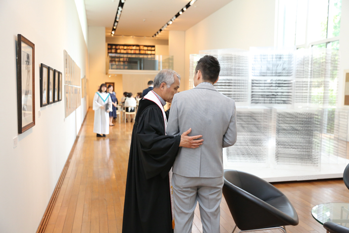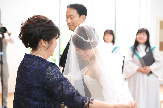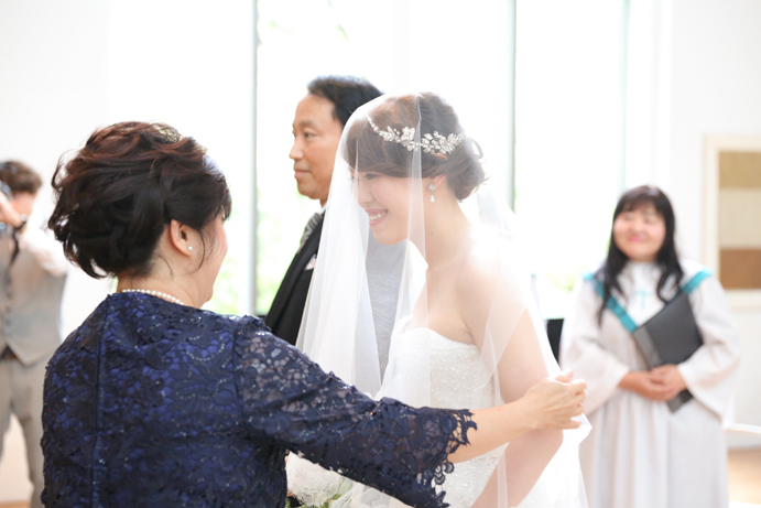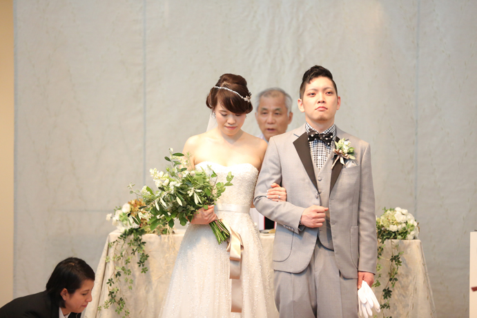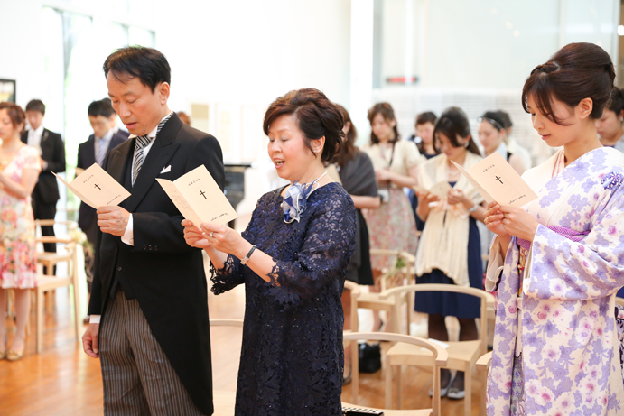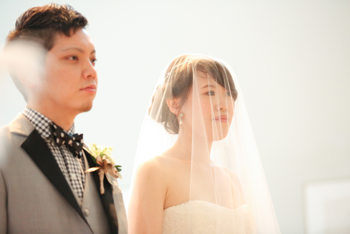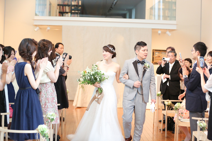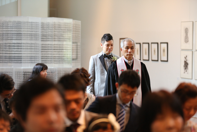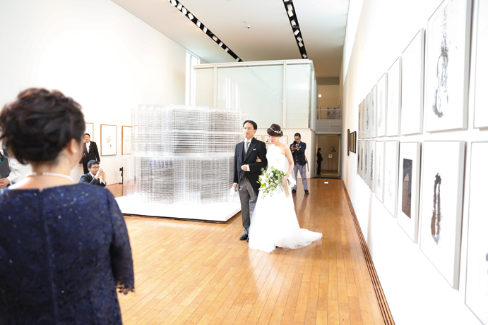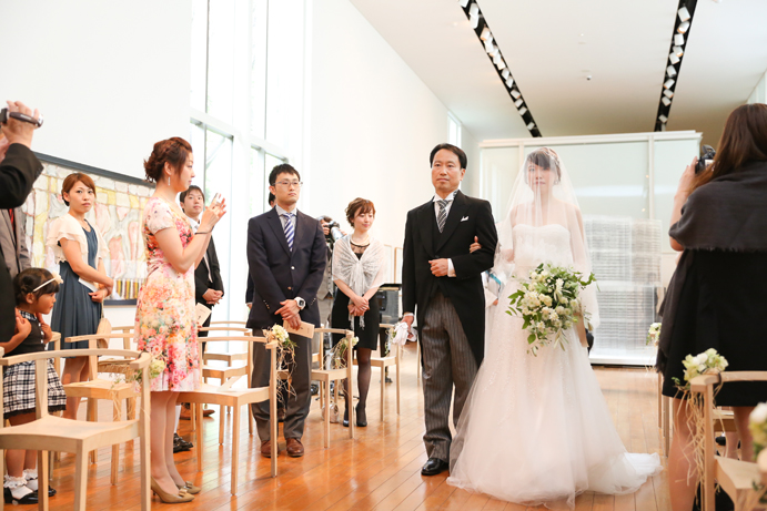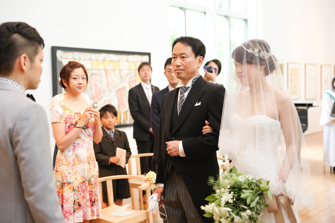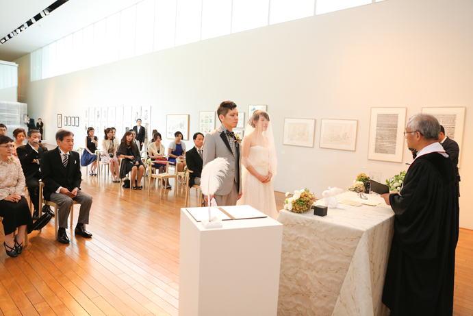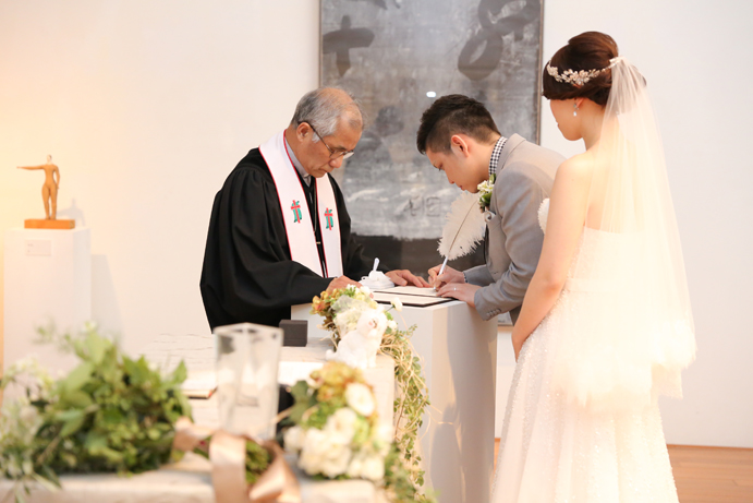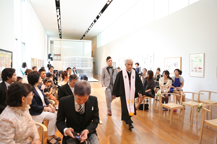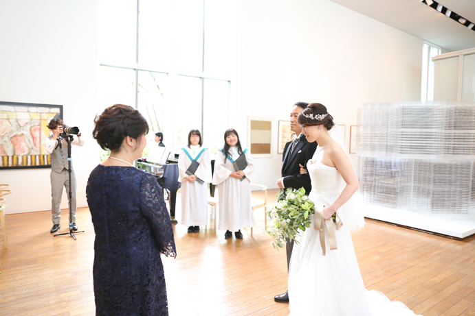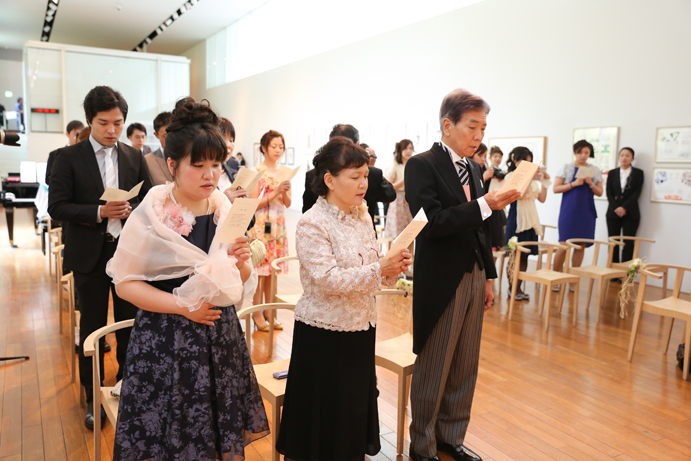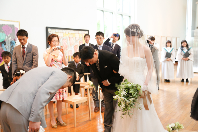 笑顔でアルテジオ入り口のスロープを進んだおふたり。会場には既に列席者の方と牧師の先生が待っていました。まずは新郎様が入場の手ほどきを受け、牧師の先生の先導のもと入場。次に新婦様がお父様と入場され、会場内でお母様からのベールダウンを受けて進みます。そこで新郎様とバトンタッチです。今回の挙式はキリスト教式にてとり行われた為、結婚の誓いは神様へする事になります。そこが人前式と異なるところですね(人前式は参列者に誓いを立てます)。もちろん聖歌もみなさんと一緒に歌いますよ。アルテジオ美術館の洗練された美しい空間で執り行うキリスト教式、やっぱりステキです。