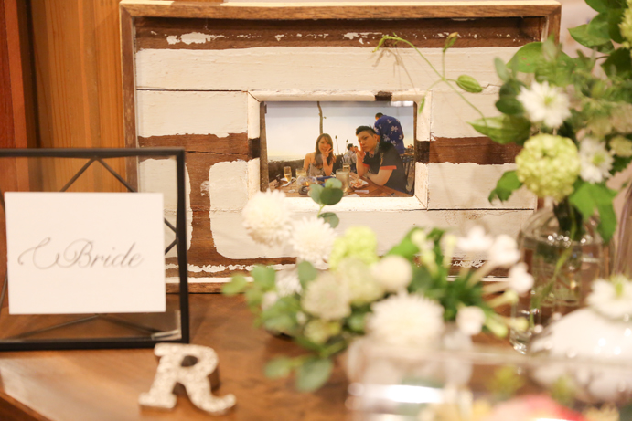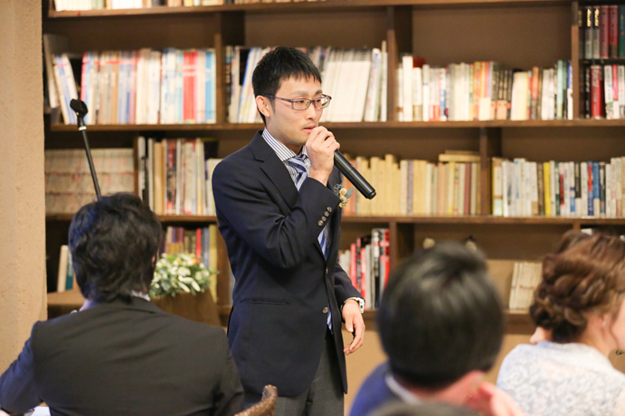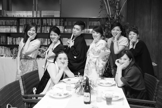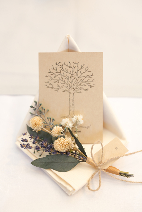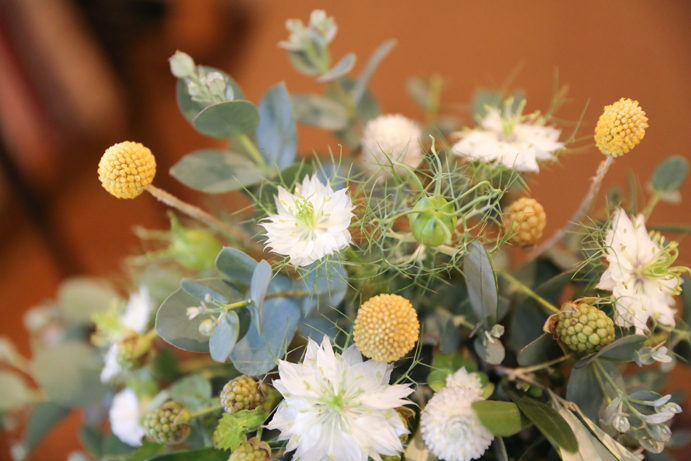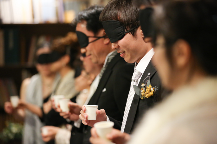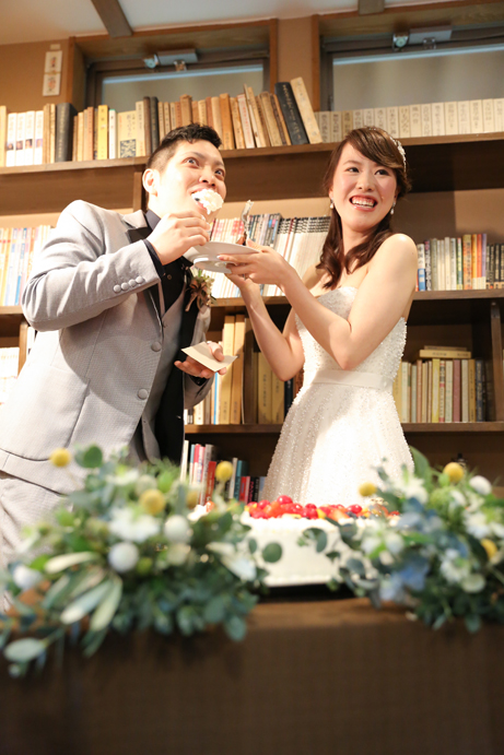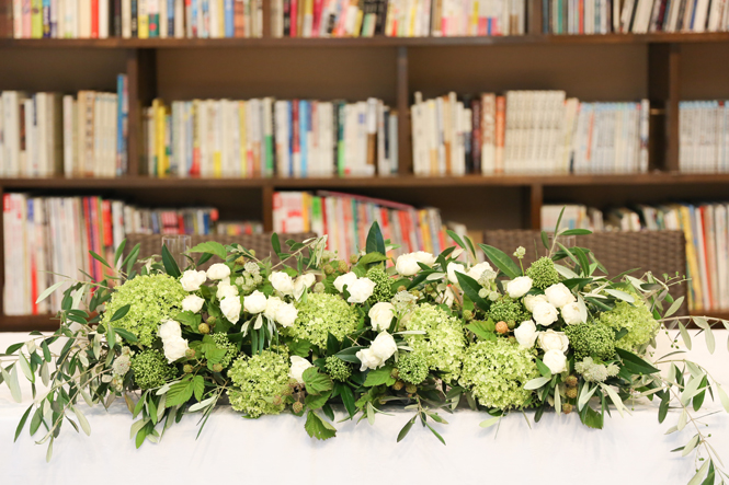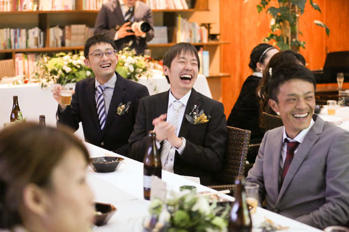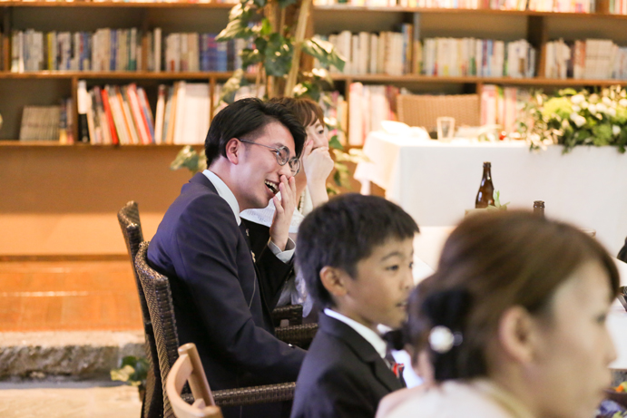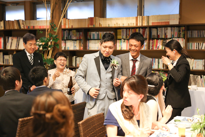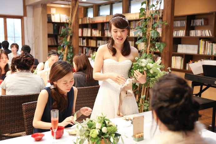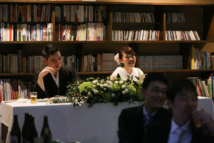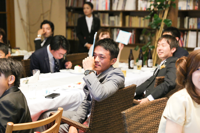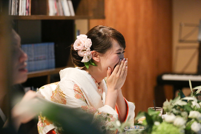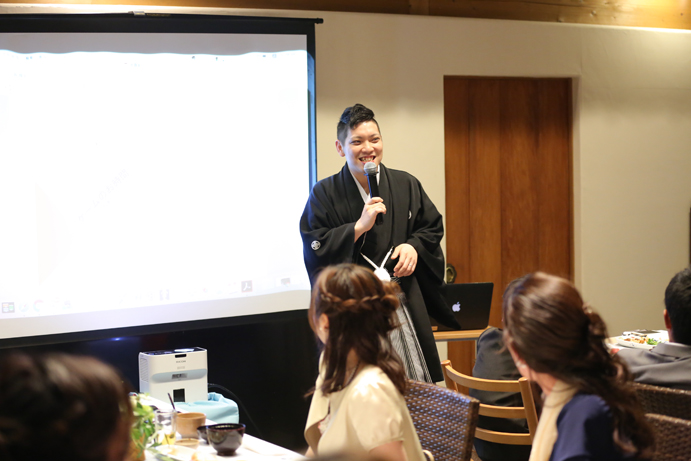 さて今回はおふたり手作りのアイテムでテーブルや受付を飾りました。もちろんそれに合わせて会場の装花やテーブルナプキンをいっしょにビデオ通話で打合せ(関東にお住まいの為)をして決めていきましたよ。ドライフラワーのコサージュやメニュー表も新婦様の手作りで、出来上がったテーブルコーディネートも本当にかわいらしいものでした。そしていざパーティーが始まるとあっと言う間。楽器の演奏あり、爆笑のおふたり手作りのムービー(NHKのプロフェッショナル仕事の流儀風)ありと、本当に良い時間が流れていました。後半のハイライトとしておこなったゲームは新郎様が自ら司会進行をし、それも大変盛り上がりましたよ〜。最後は博多一本締めにて結びとさせていただきました。