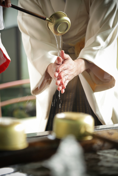 朝から半日掛けて、沢山写真を撮影しました。写真では色打掛を最初にご紹介しておりますが、実はドレスから撮影しています。白ドレス、色ドレス、色打掛、白無垢の順番です。何故その順番に撮影したかというと、神社挙式にスムーズに移行できるようにするため。それにしても本当に仲の良いおふたりで、撮影中も笑いが絶えませんでした。新郎様が結構爆笑してますね。こうゆう写真大好きです。さて陽も微妙に傾き始めました。挙式の時間です。